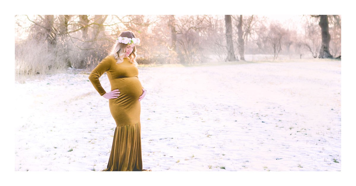 Wunderschön, das winterliche Bild in dem schlichten weißen Rahmen. Diese Mami trägt eins meiner Babybauchkleider in gold olive. Wie gemacht für den Platz über der Kommode mit den goldenen Knöpfen.